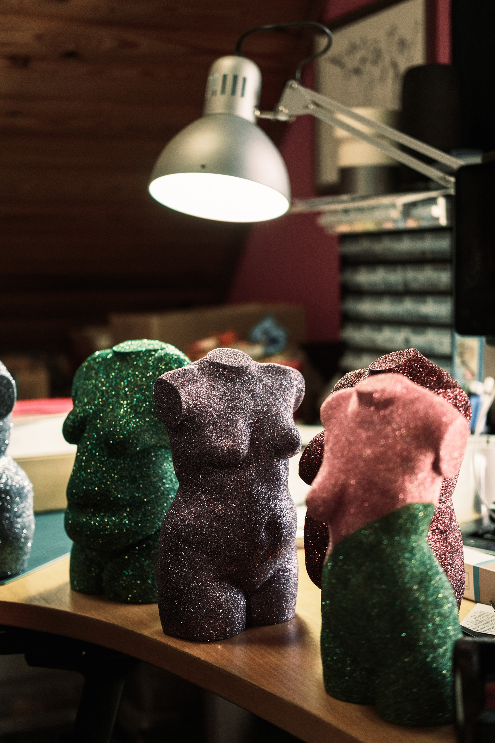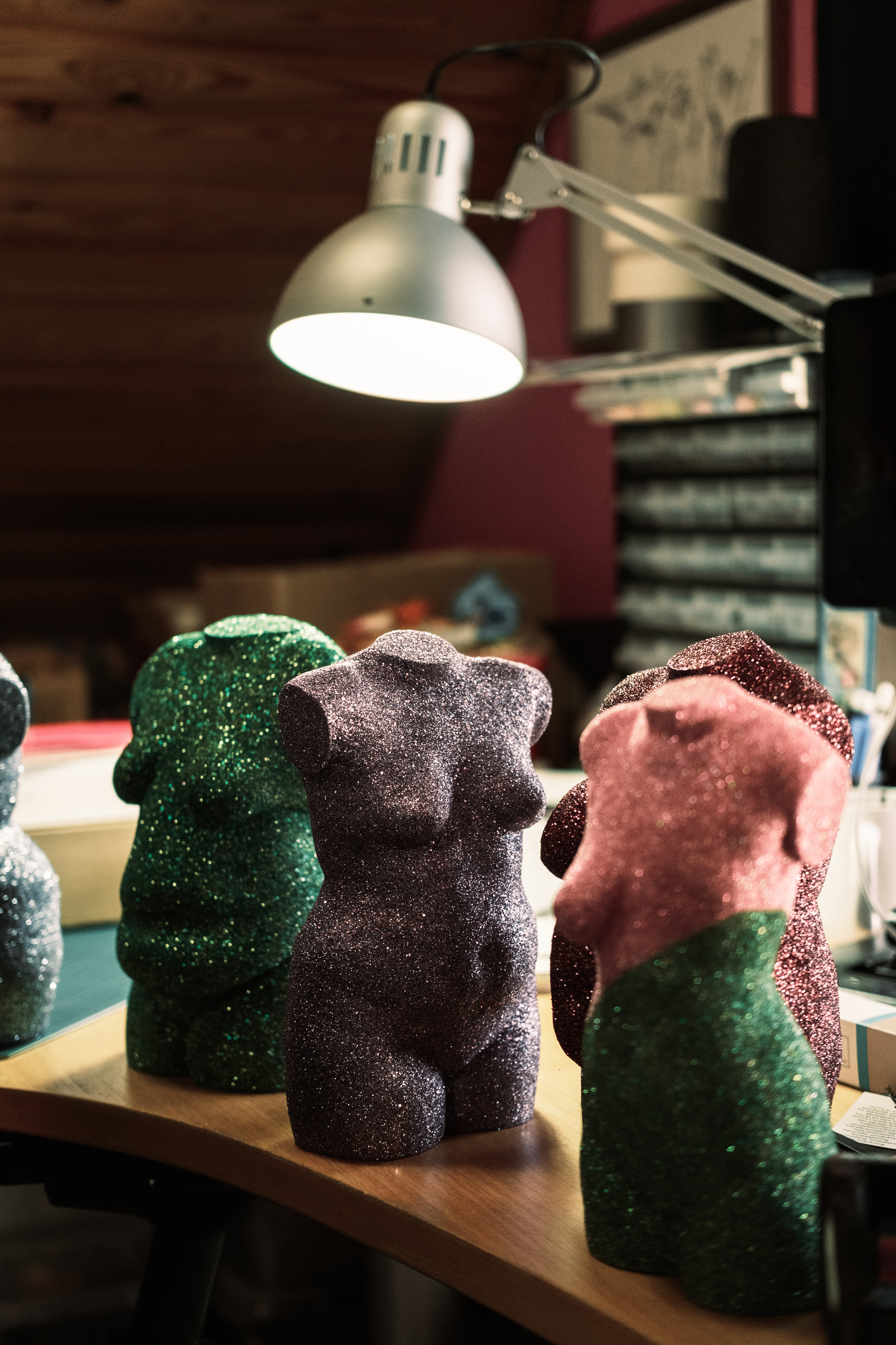 The upper half of a mannequin stands as a sculpture of a slender female torso halfway up the staircase leading to the first floor of the home. The sculpture contrasts sharply with the glitter-covered figures that appear in all sizes throughout the workshop and in Regina’s office. Regina placed the torso as a permanent artwork on the staircase because she thought it looked decorative. Here it stands as a clear symbol that the message is not to condemn slender bodies, but rather to embrace all body types.