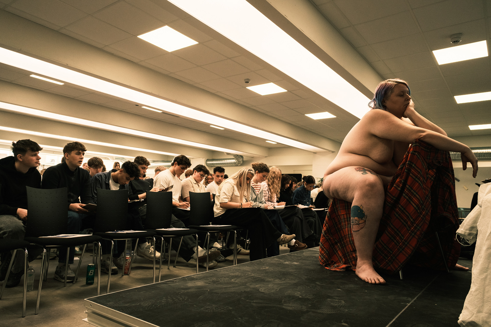 Regina doing her final pose during the Muscular Dystrophy Foundation’s ‘Pærfekt’ campaign at a business college on February 19, 2025. Some of the participating students had to be reprimanded during the event for showing a lack of seriousness and maturity. This was the longest posing round, where Regina chose to sit with her back to the audience.