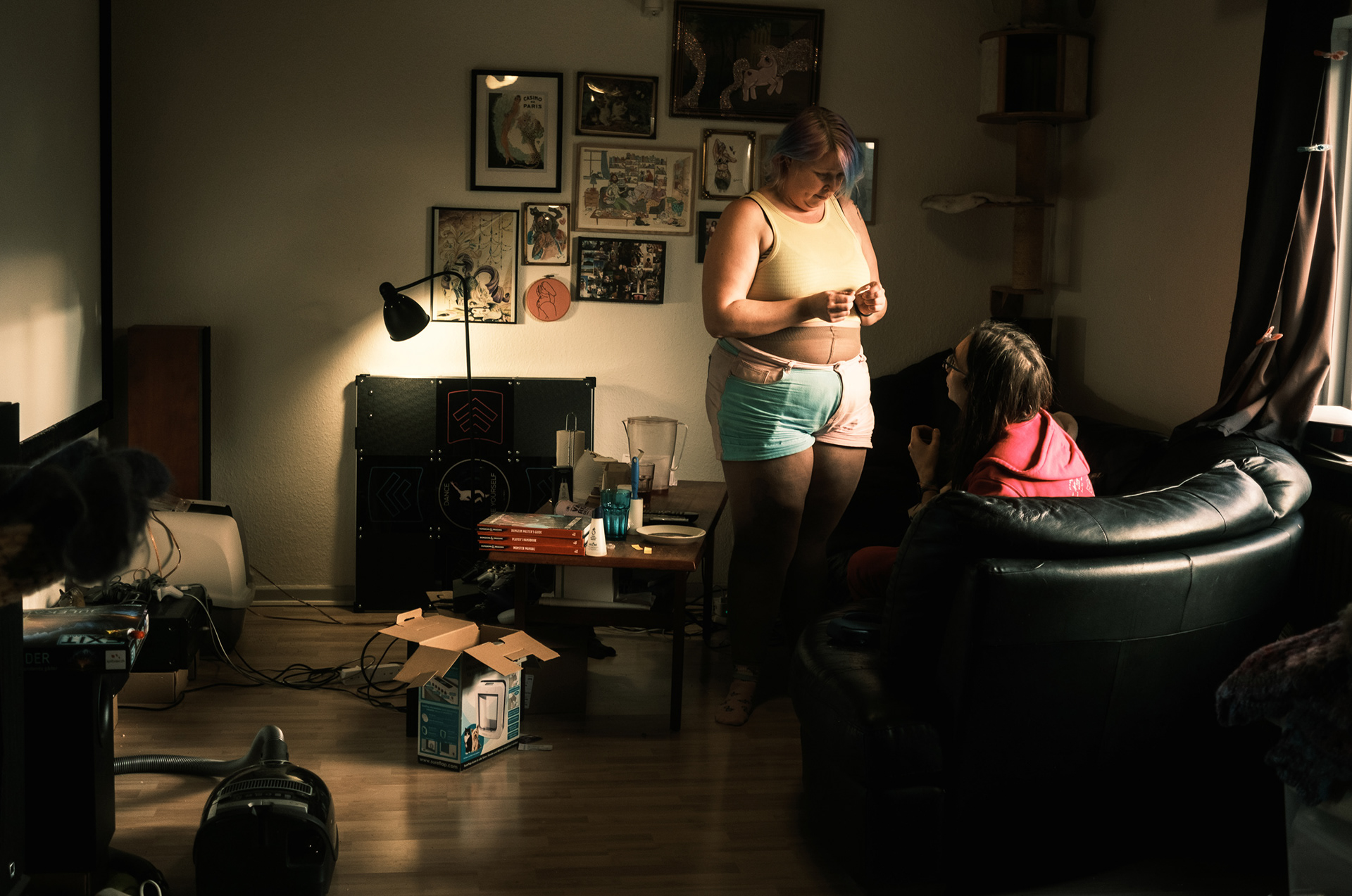 Regina and her partner, Bjarke, in their living room on February 17, 2025. Bjarke supports Regina in her activist work by providing a stable financial foundation that allows her to focus on running her own activist business.