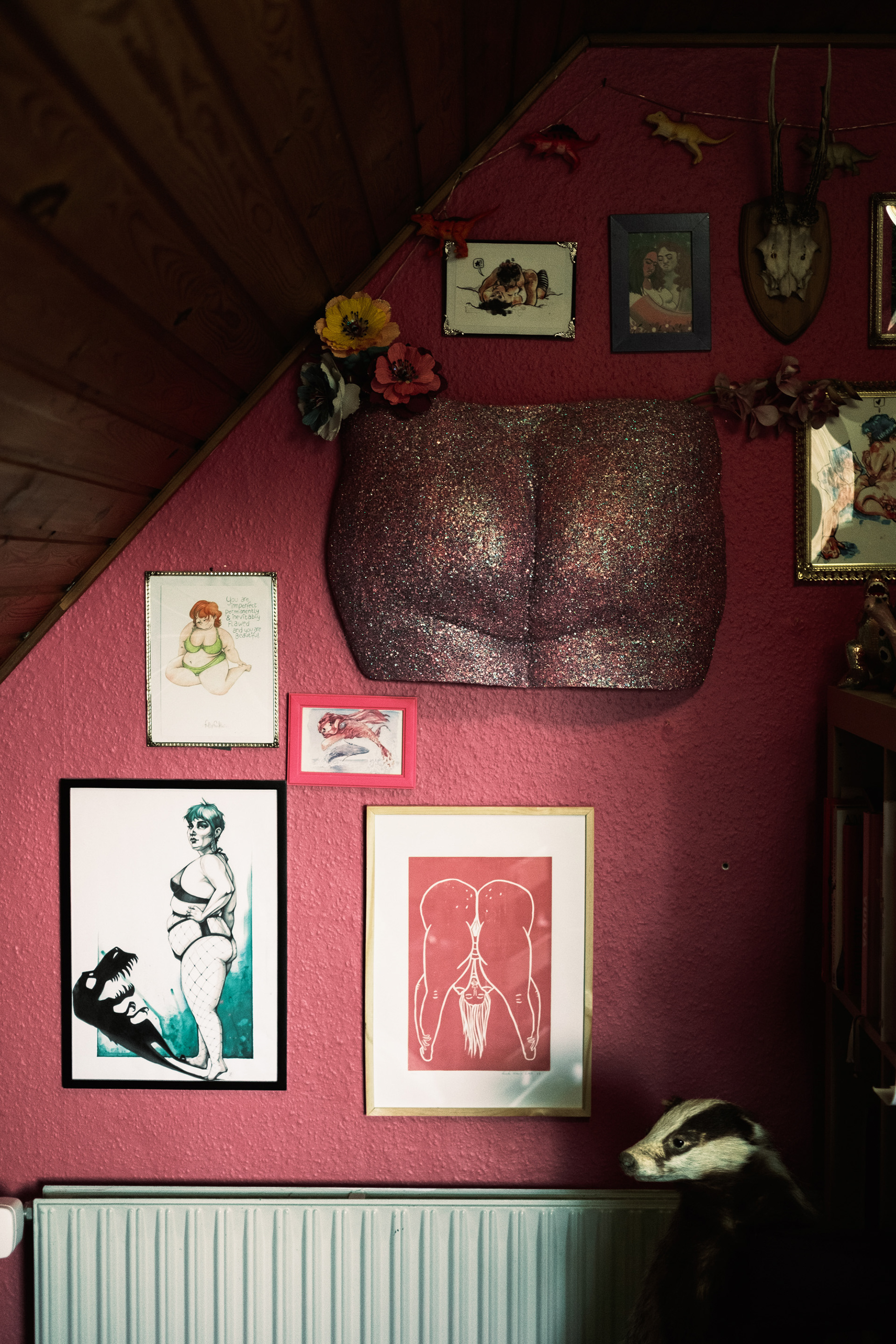 A life-size cast of Regina’s buttocks, covered in glitter, decorates her office wall alongside framed pictures of bodies in various poses.