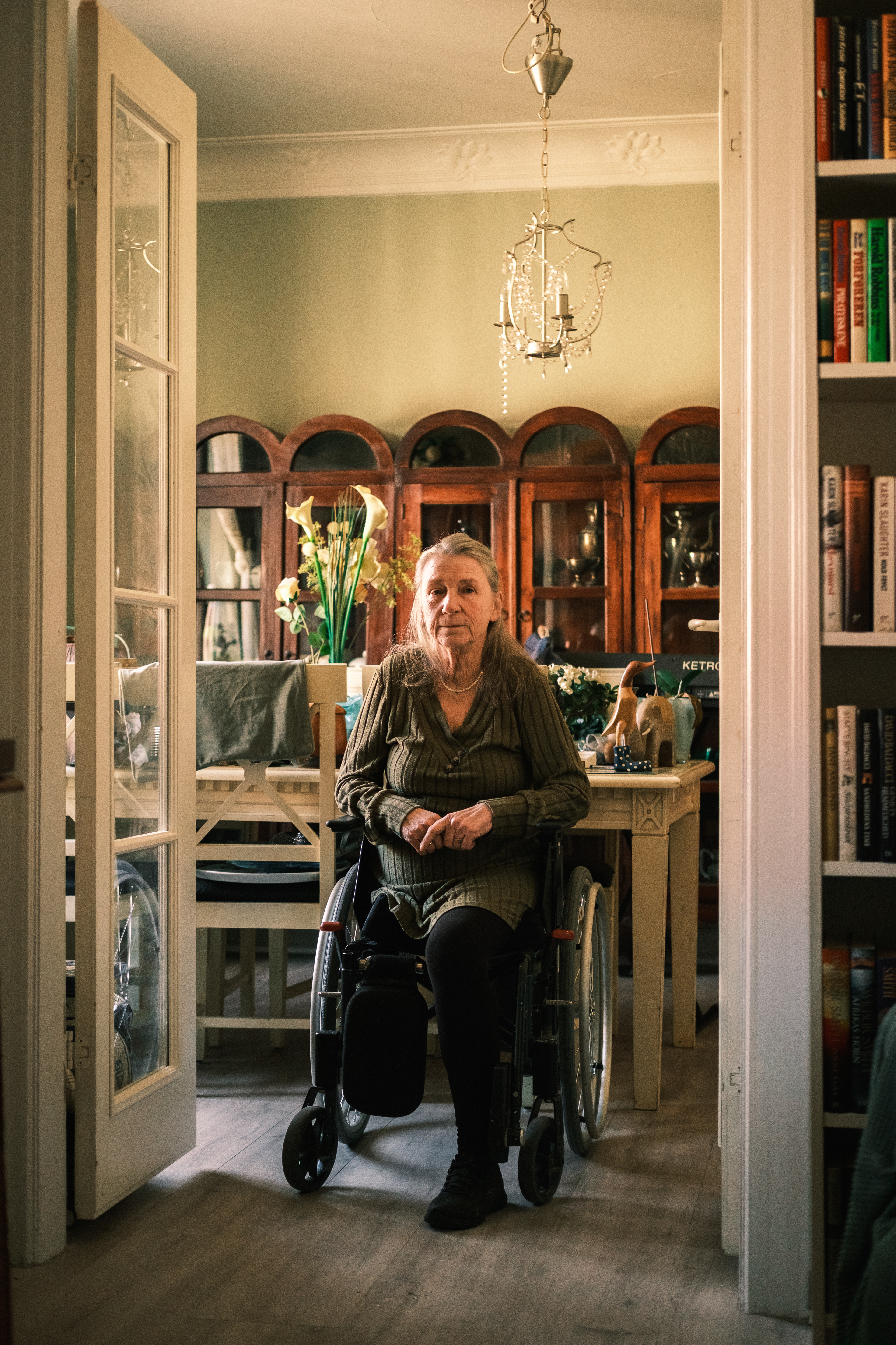 After running their tavern for a few more years, Eva needed a change. She began working as a groundworks laborer. In 2008, on a rainy day, she slipped in the mud and a motorized wheelbarrow fell on top of her. Her right leg was crushed and later amputated. She received a disability pension, but soon felt she lacked purpose. She then took a kitchen job at a local tavern, where she spent nine years. By chance, she later had the opportunity to purchase Bykroen, a small tavern in Randers. Since then, she has run it almost single-handedly from her wheelchair. At the back of the tavern, an old, steep staircase leads up to Eva’s home, just above the bar.
